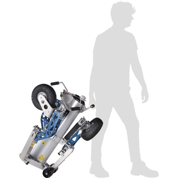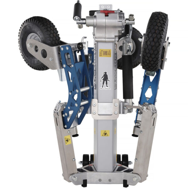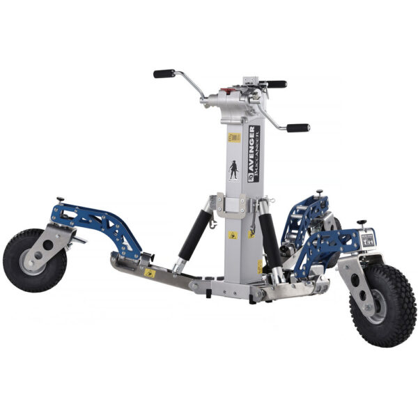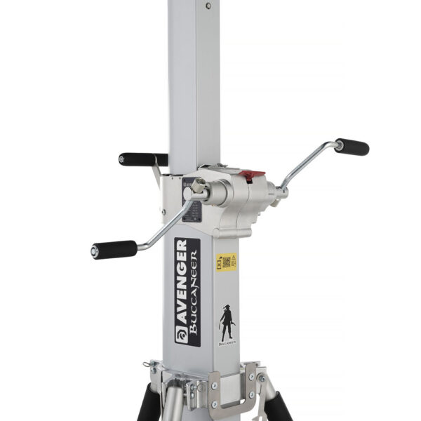 The Buccaneer Stand from Avenger is a wind-up stand with a low-loading height of 3.1′ and a maximum height of 9.8′. It has a robust payload of 176.3 lb. The column is extended using a winch-driven column system with a dual-handled crank. The top of the column has a 1 1/8″ junior receiver suitable for mounting large light instruments. The reverse folding base has an open diameter of 31.4″. Each leg features a braked, puncture-proof foam-filled wheel.